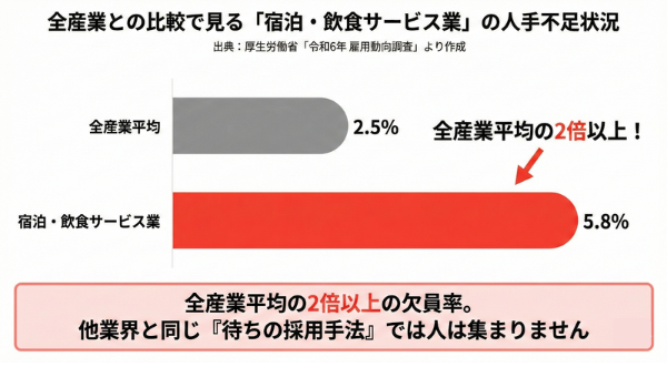 厚生労働省の「雇用動向調査」によると、宿泊・飲食サービス業の欠員率は全産業の中でも常にトップクラスです。