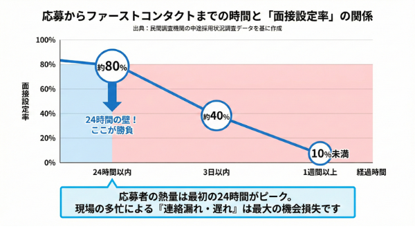 マイナビの中途採用状況調査などのデータによると、応募から24時間以内にファーストコンタクトがあった場合の面接設定率は、3日以上経過した場合と比較して劇的に高いことが示されています。