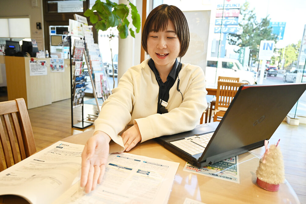 主に、整備や点検でご来店されたお客様に対し、自動車保険の内容見直しや新規加入のご提案を行います。