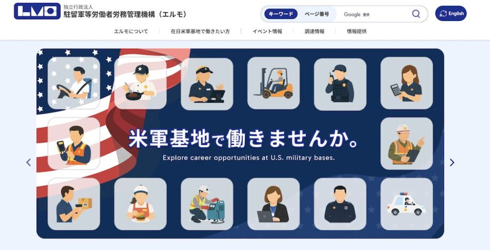 「独立行政法人 駐留軍等労働者労務管理機構(エルモ)」は、日米の両者に連携し、従業員が安定した環境で働けるよう労務管理などのサポートをしています。
